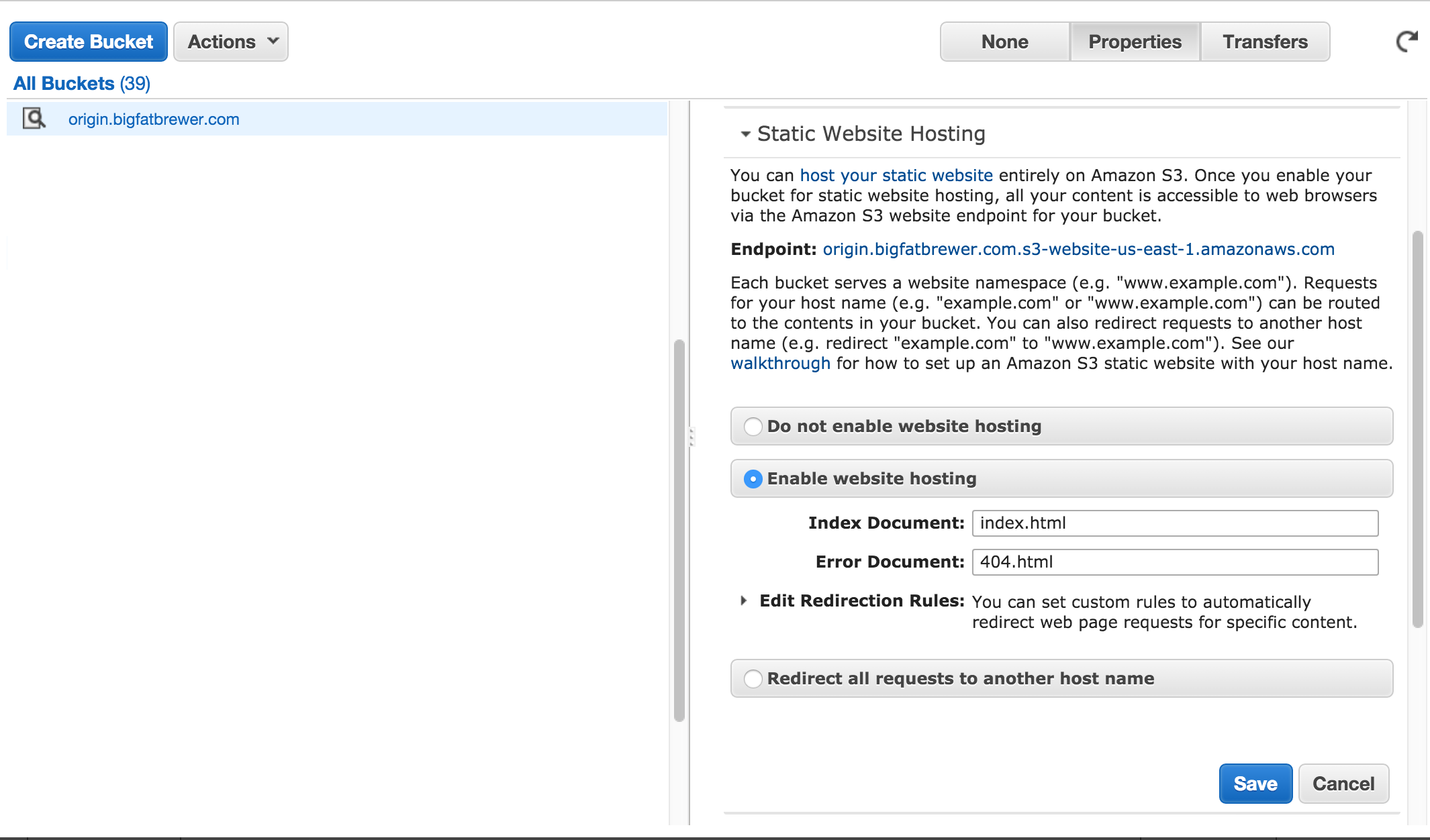 Next create a bucket named “www.hostname.com” and set the “Static Website Hosting” section in the properties like so:
