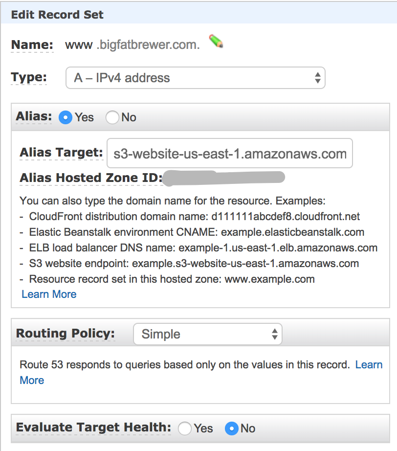 So I set out to port my sites from Drupal to Hugo/S3/Route53/CloudFront. I had always done something slightly unusual with my domain names since I detest the “www” prefix that most websites use. I had setup my apache to redirect www.foo.com to foo.com and I have several domains that are aliases for other domains. For instance I have a beer related blog called bigfatbrewer.com but I also have bigeffingbrewer.com, and bigfuckingbrewer.com. Both of which need to redirect to bigfatbrewer.com. So I needed to have a way of redirecting multiple domains to a main domain and a way to serve the static content so that CloudFront can access it. The solutions to these use cases are provided by S3 and Route53.